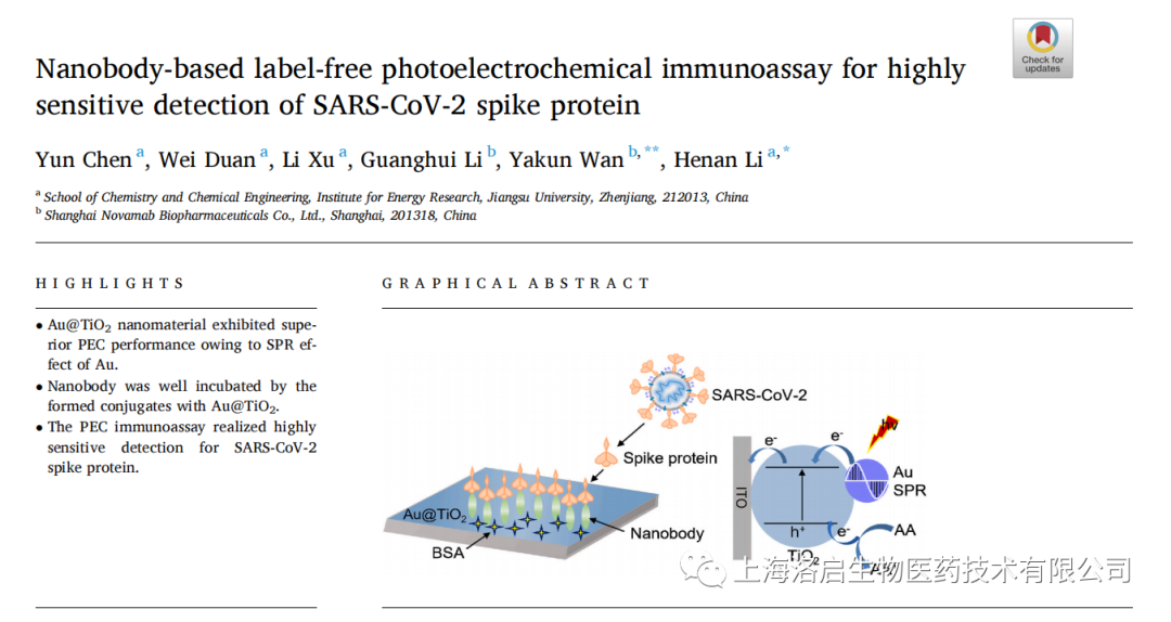 2022年5月3日,公海555000官网生物和江苏大学化学化工学院李赫楠教授团队合作,在《Analytica Chimica Acta》发表了题为“Nanobody-based label-free photoelectrochemical immunoassay for highly sensitive detection of SARS-CoV-2 spike protein”的研究论文。公海555000官网生物万亚坤博士和李贺楠教授为并列通讯作者,相关纳米抗体的知识产权归公海555000官网生物所有。