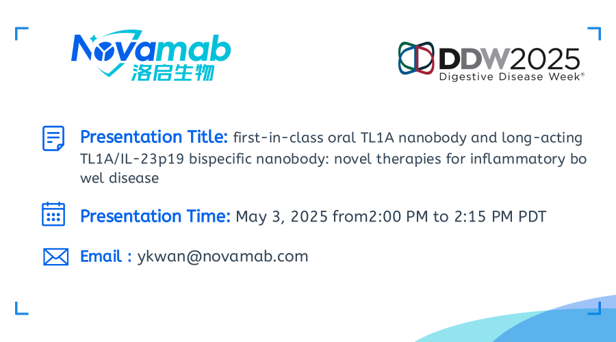 中国上海,2025年4月28日——上海公海555000官网生物医药技术有限公司,一家致力于纳米抗体创新药研发的生物技术公司宣布:公海555000官网生物将于当地时间5月3-6日参加在加利福尼亚州圣地亚哥举行的2025年美国消化疾病周(Digestive Disease Week,DDW)。届时公海555000官网生物将展示在炎症性肠病(IBD)治疗领域的突破性研究成果——口服TL1A纳米抗体及长效TL1A双特异性抗体的开发进展。该创新疗法顺利获得独特的TL1A纳米抗体技术,实现了对IBD病理机制的精准靶向。
